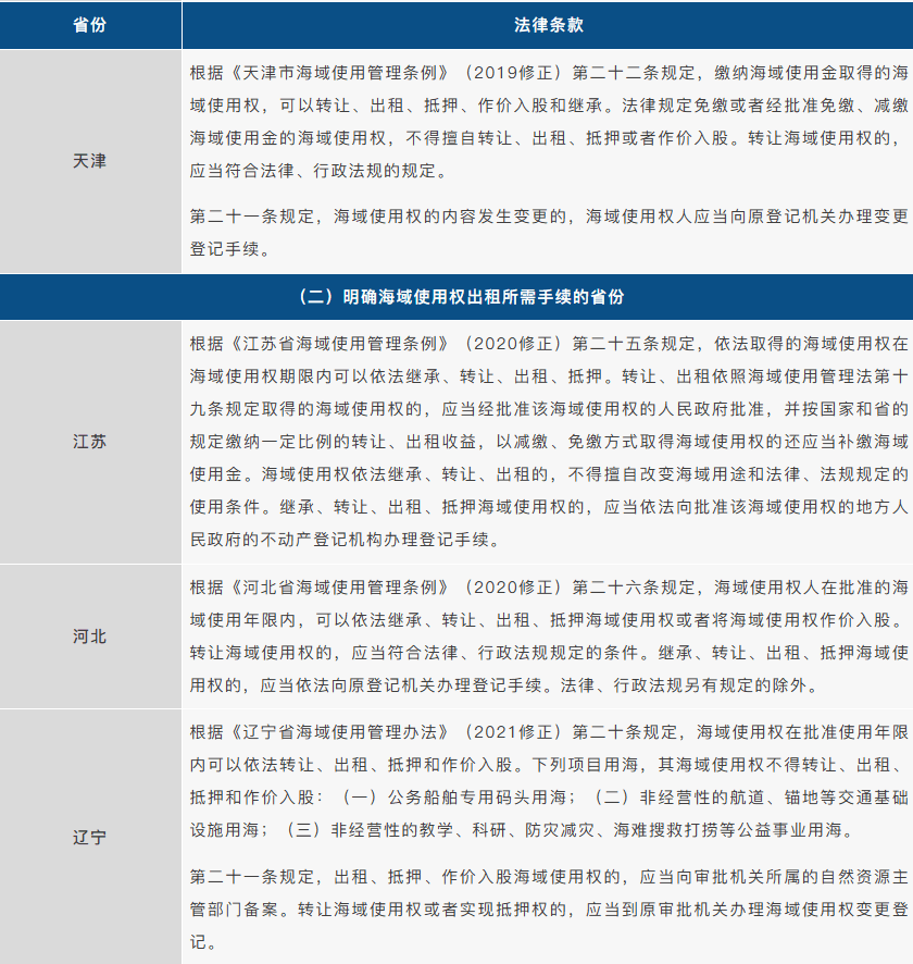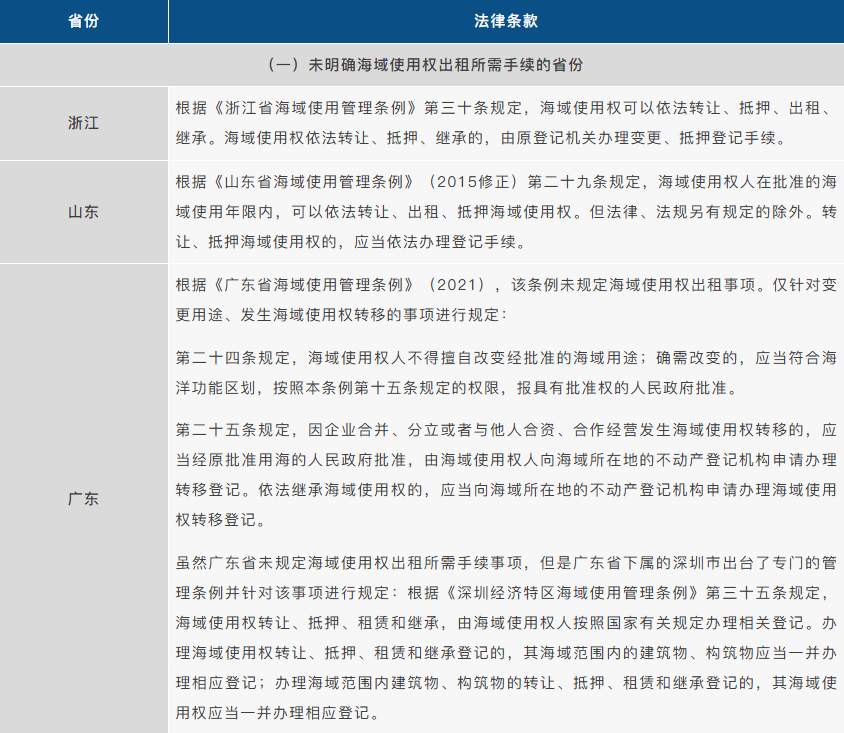 针对出台管理条例明确办理海域使用权出租手续的省份,我们发现在河北政务服务网、辽宁政务服务网、福建省网上办事大厅、广西数字政务一体化平台中均未见海域使用权出租审批事项,仅在江苏政务服务网中的“海域使用权转让审核”事项中明确了出租的受理标准。经我们电话咨询有关海域使用权主管部门,各地针对海域使用权出租事项的管理要求存在差异,其中江苏省海域海岛管理处表示必须办理海域使用权出租登记,登记方式为提交资料后由登记机构备注出租即可,无需重新申请登记手续。浙江省自然资源厅海域海岛管理处则表示,目前海域使用权出租无需办理专门审批事项,只要不改变海域使用权的用途和范围,即无需履行审批和登记手续。