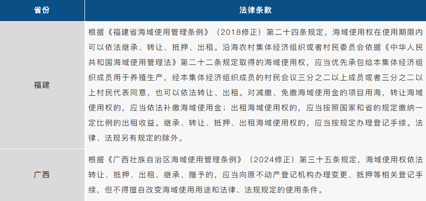 另外,针对海域使用权出租事项是否需要办理登记,沿海各省市的具体管理要求不一致,相关海域使用管理条例规定如下:
