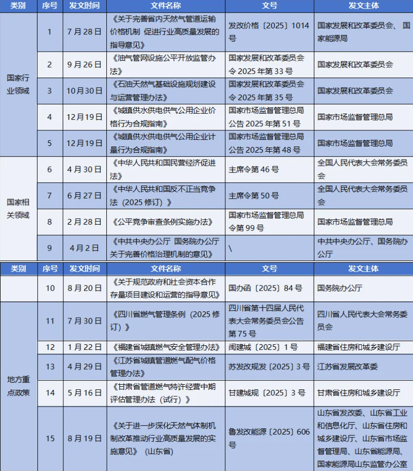 在此背景下,国家及地方层面相继出台一系列具有针对性、系统性的政策法规,从基础设施公平开放、管道运输价格机制完善、公用企业行为规范,到营商环境优化、竞争秩序维护、行业安全与特许经营监管等多个维度,推动法律环境进一步完善。面对行业监管的持续强化与市场环境的深刻变化,行业企业应如何把握行业发展的机遇,适应监管新趋势?我们精选了部分具有代表性的法律法规和政策文件,与您共同回顾这一年的演进脉络。![]()